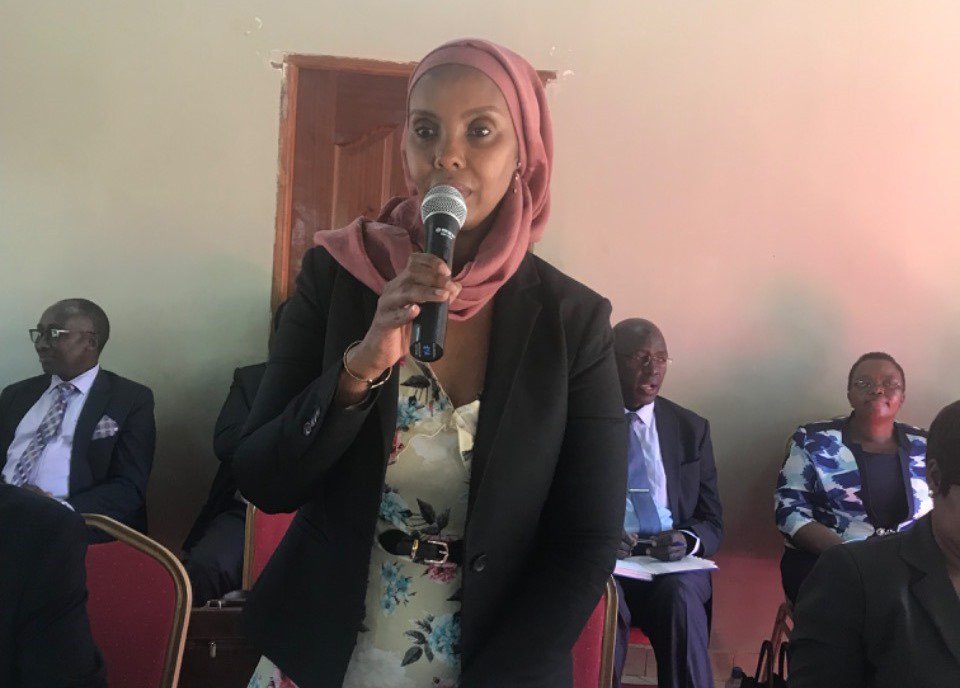 TSC commissioner Leila Ali during an education stakeholders meeting at Green Park in Wote, Makueni County. Photo Lydia Ngoolo.