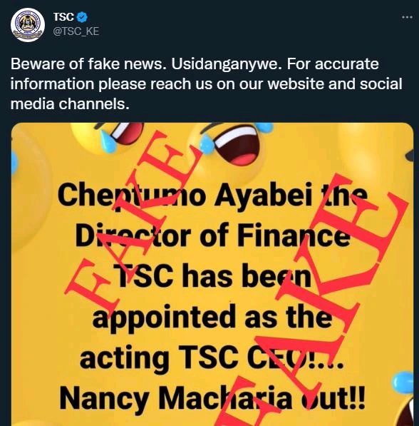 Teachers Service Commission urged teachers and Kenyans at large to disregard such information saying they are fake. Teachers employer have advised kenyans to search for accurate information on TSC website and social media channel.